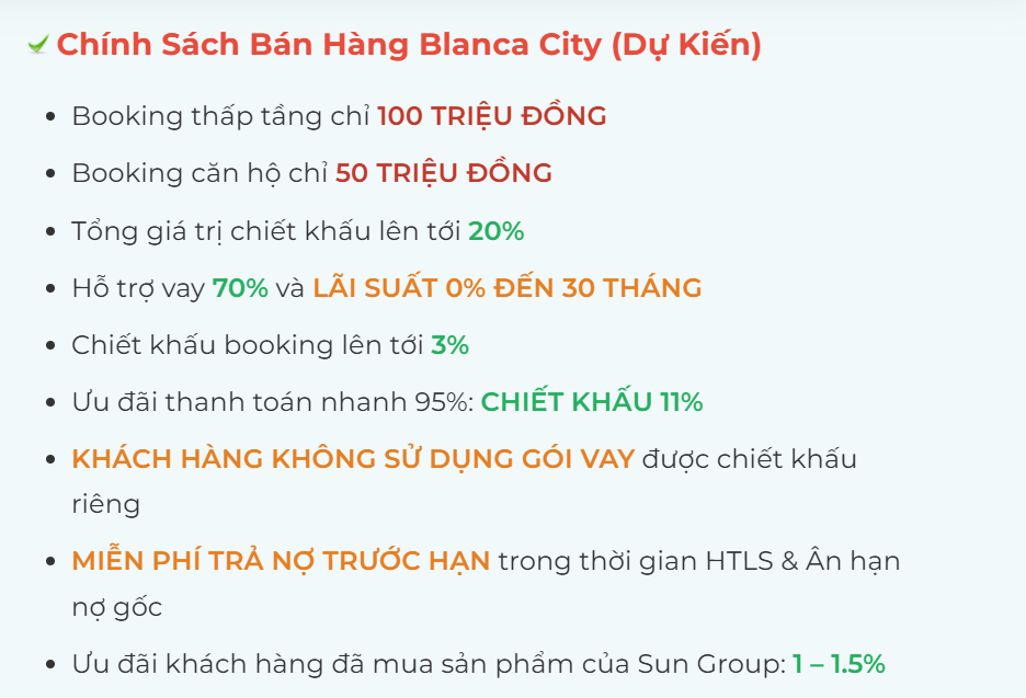 Hiện tại, mức giá bán rumor của Blanca City tùy theo từng phân khu căn hộ là: